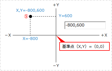 ②「-500」:基準点からX軸-方向に500、Y軸方向に0
