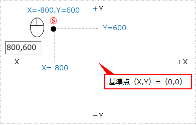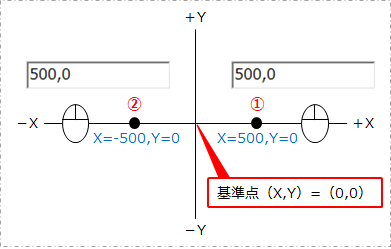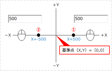 ①マウスをX軸の+方向に配置:基準点からX軸+方向に500、Y軸方向に0
