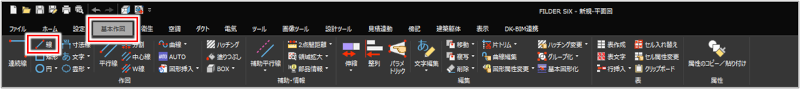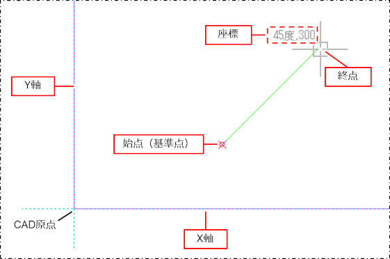 図形を作図する場合は、前回クリックした座標を基準点として、基準点からの相対的距離や角度を確認し、終点を指示します。基準点を変更することもできます。