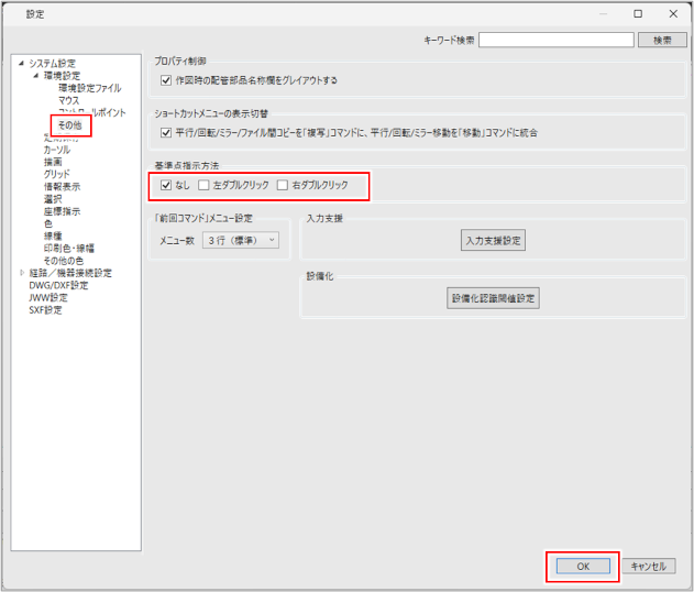 [環境設定]の[その他]をクリックして、[基準点指示方法]で[左ダブルクリック]または[右ダブルクリック]にチェックを付け、[OK]ボタンをクリックします。