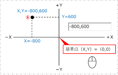 例:基準点からX軸-方向に「800」、Y軸+方向に「600」の距離を移動する場合