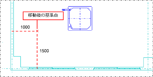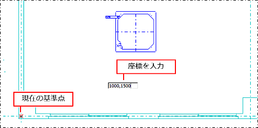ここでは、例として基準点から横方向(X軸方向)に1000、縦方法(Y軸方向)に1500の位置を始点とするため、「1000,1500」と入力し、[Enter]キーを押します。