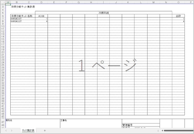 冷媒分岐キット集計表の内容は、以下のとおりです。