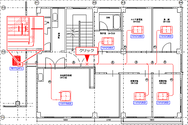 冷媒配管、室内機、室外機、レフネットジョイントのいずれかを指示すると、冷媒系統が選択されます。冷媒系統は複数選択できます。ただし、範囲選択することはできません。