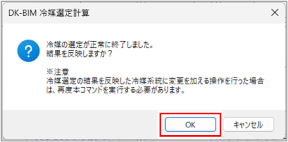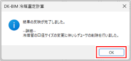 冷媒系統の計算結果が図面に反映され、反映完了のメッセージが表示されます。メッセージ内容は、計算結果により変わります。