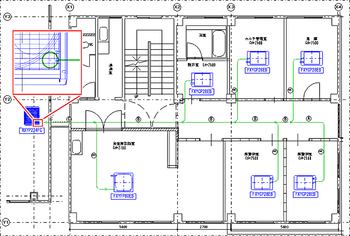この例では、冷媒配管の口径を設定せずに室外機と接続しているためレデューサが配置されていますが、実行後に自動で削除されます。