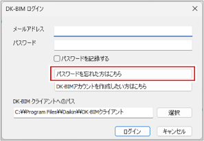 メールアドレスとパスワードを入力し直してください。 大文字・小文字が正しく入力されているか、メモ帳などに貼り付けて確認してください。 パスワードを忘れた場合は、[DK-BIMログイン]ダイアログの[パスワードを忘れた方はこちら]ボタンをクリックし、仮パスワードを再発行してください。