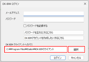 [DK-BIMログイン]ダイアログの[DK-BIMクライアントへのパス]が正しいか確認してください。デフォルトのインストール先は「C:\Program Files\Daikin\DK-BIMクライアント」です。 インストール先を変更している場合は、[選択]ボタンをクリックし、「ThermalLoadCalculator.exe」が存在するフォルダを指定してください。
