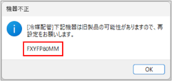 冷媒系統に旧製品が含まれていると、以下のようなエラーが表示され、該当の機器名が表示されます。