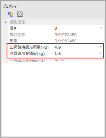 - 室外機または室外機情報を付加した冷媒管をクリックし、[プロパティ]に[出荷時冷媒充填量][冷媒追加充填量]が設定されていることを確認します。