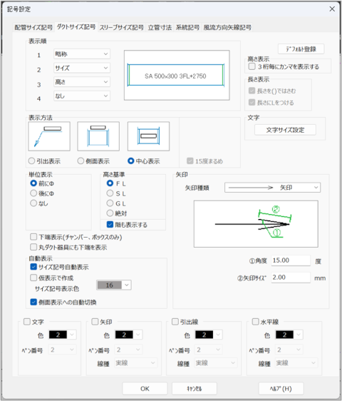 チェックを付けると、ダクトサイズ記号の矢印の色、およびペン番号を設定できます。 |