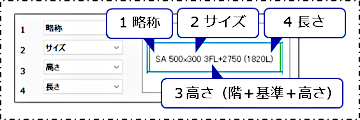 略称、サイズ、高さ、長さの表示順序を設定します。1~4の番号の順序で各項目が表示されます。表示する必要がない場合は「なし」を選択します。 以下は、[表示順]の設定と実際の表示の一例です。 シートに階を設定している場合は、[高さ]を選択すると階情報も表示されます。