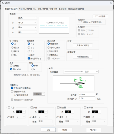 配管サイズ記号の表示順序や表示方法などを設定します。また、衛生配管や、空調配管を連続配管で作図する場合、配管サイズ記号の自動表示の有無などを設定できます。