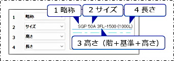略称、サイズ、高さ、長さの表示順序を設定します。1~4の番号の順序で各項目が表示されます。表示する必要がない場合は[なし]を選択します。 以下は、[表示順]の設定と実際の表示の一例です。 シートに階を設定している場合は、[高さ]を選択すると階情報も表示されます。