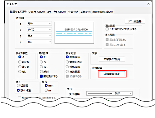 冷媒配管記号を表示する際の表示順序、使用する記号の選択、高さの基準、配置、サイズ表示の方法などを設定します。
