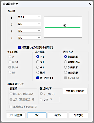 略称、サイズ、高さ、長さの表示順序を設定します。1~4の番号の順序で各項目が表示されます。表示する必要がない場合は[なし]を選択します。 右側に冷媒配管記号のプレビューが表示されます。 |
