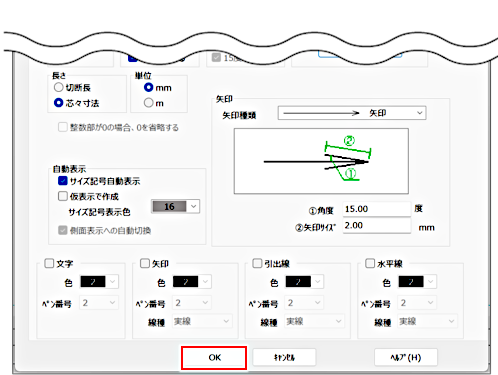 チェックを付けると、配管サイズ記号の矢印の色、およびペン番号を設定できます。 |