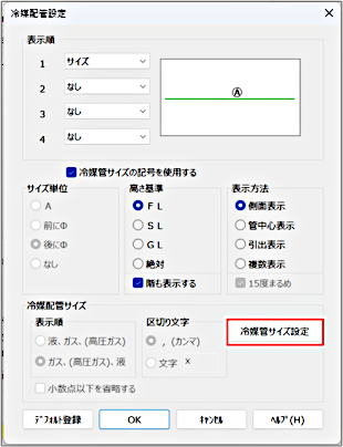 冷媒管サイズの表示順序、区切り文字、小数点以下の扱いを設定します。