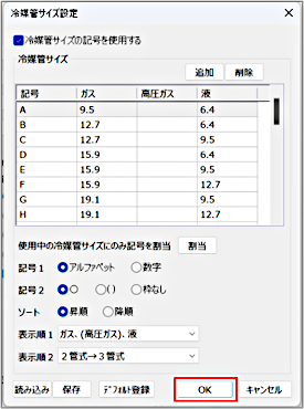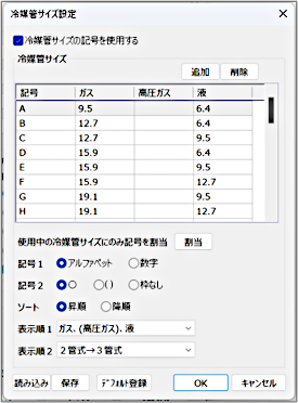 冷媒管サイズの追加や削除、冷媒管サイズへの記号の割り当て、表示順序を設定します。