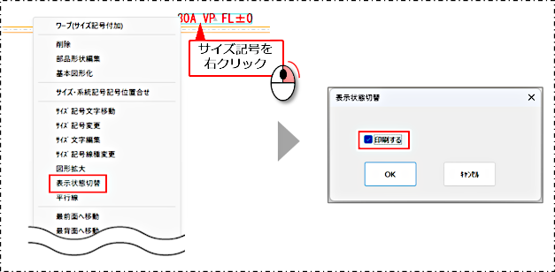 配管サイズ記号を仮表示する場合はチェックを付けます。仮表示されている配管サイズ記号は印刷されません。