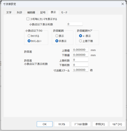 寸法線を作成するときの、寸法値の小数点以下の表示や寸法線スケールなどを設定します。