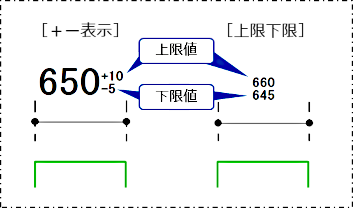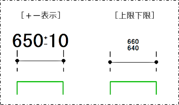 許容寸法として表示する内容を[+ー表示]または[上限下限]から選択します。 |