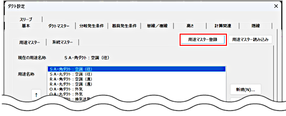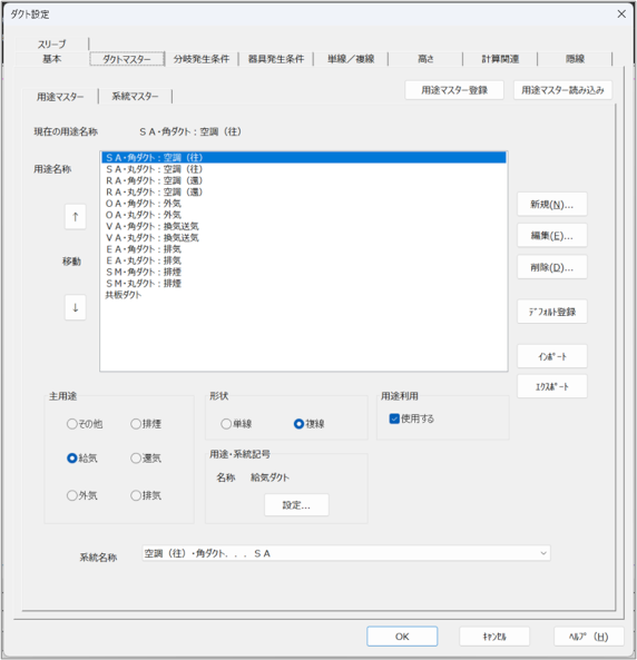 [用途マスター][系統マスター]を組み合わせて、1つのダクト用途を作成します。