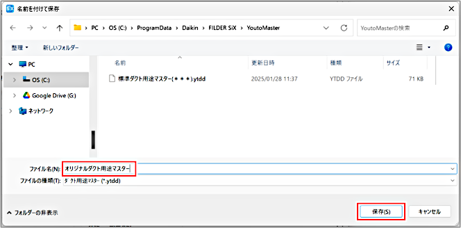 用途マスターをダクト用途マスターファイル(*.ytdd)として保存できます。任意のファイル名を付けることにより、複数の用途マスターを登録できます。