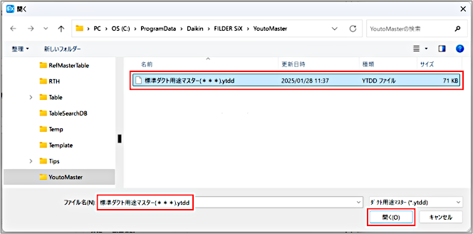 ファイル名の「***」には、バージョン情報が入ります。 例:「標準ダクト用途マスター(SIXV10).ytdd」 |