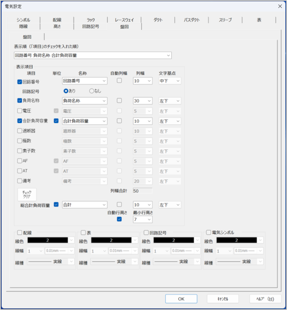 盤図で使用する表示項目、項目の表示順、色・線幅・線種などを設定します。