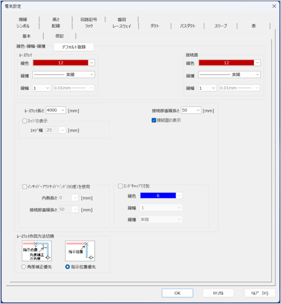 レースウェイの作図方法を、[角度補正優先]または[指示位置優先]から選択します。