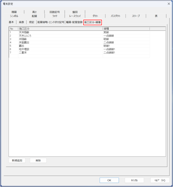 施工区分ごとの線種を確認・変更することや、施工区分を新規追加することができます。