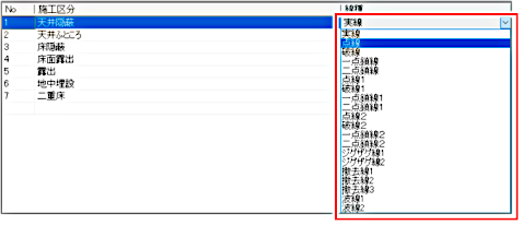 クリックすると一覧の末尾の空行が選択され、施工区分を新規で追加できます。[施工区分]を入力し、[線種]を選択します。 |