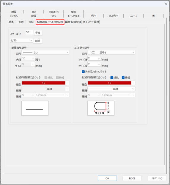 [配線省略記号][エンド伏せ記号]の設定値が、[スケール]で選択したスケールごとに登録されます。 |