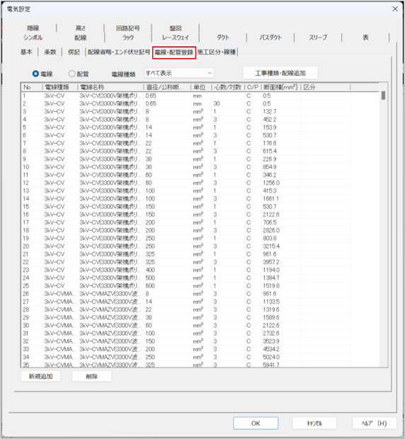 電線種類は、工事種類ごとに登録されています。工事種類の追加は、[配線追加]ダイアログで行います。