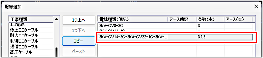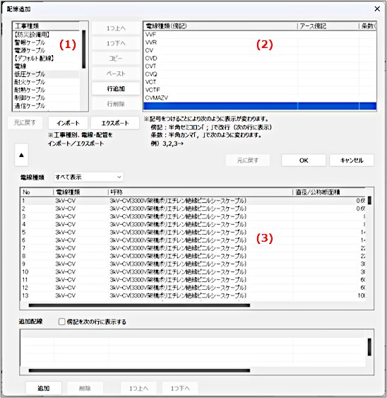 (2)の空白行を選択してクリックすると、(3)で選択した電線が追加されます。 |