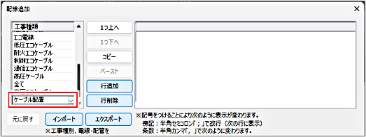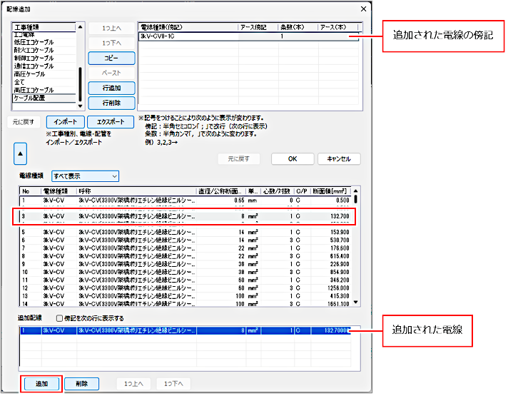 工事種類に電線種類が追加され、[追加配線]欄に表示されます。また、ダイアログ上部には、追加された電線種類の傍記が一覧に表示されます。