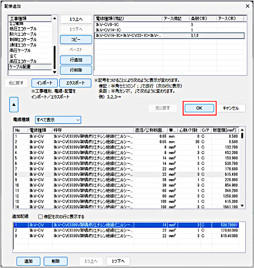 同様に操作して、必要な電線種類を工事種類に追加し、[OK]ボタンをクリックします。