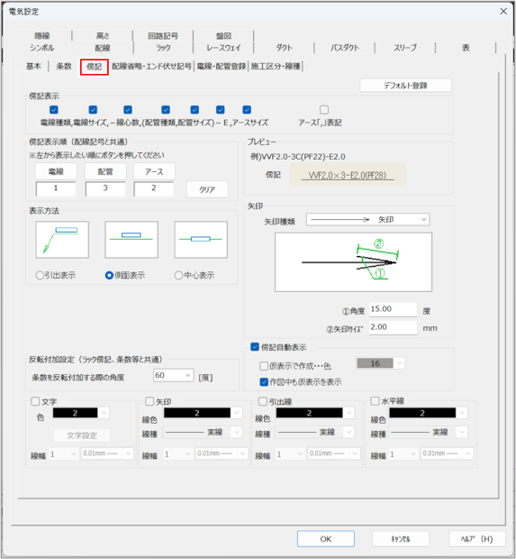 配線の傍記の表示内容、表示順、自動表示の有無を設定します。文字、引き出し線、矢印なども設定できます。