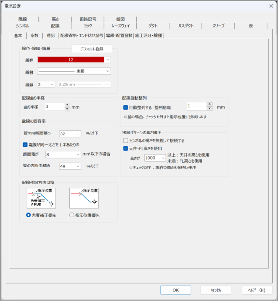 配線の曲り半径や電線の収容率、自動整列などを設定します。 |