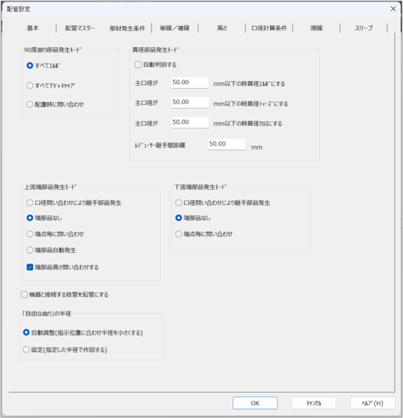 曲り部分に発生させる部品を選択します。ただし、用途が汚水、雑排水以外は、選択に関係なくエルボが配置されます。