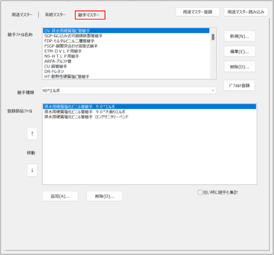 FILDER SiXに登録されている継手部品を継手ファイルに追加または削除できます。継手ファイルは、系統マスターで系統と関連付けることができます。