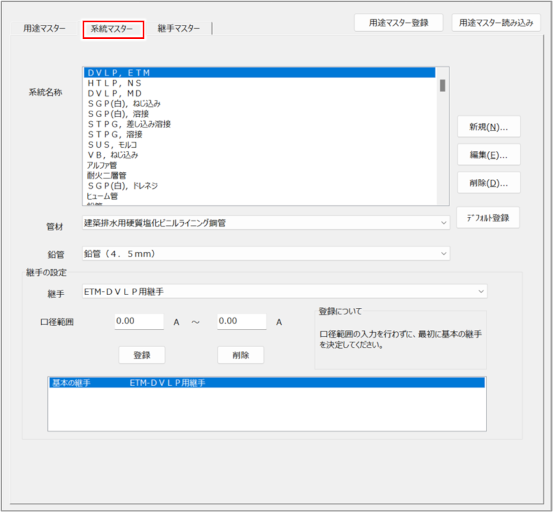 FILDER SiXに登録されている管材と、継手マスターに登録されている継手ファイルを関連付けます。設定した系統は、用途マスターで用途と関連付けることができます。
