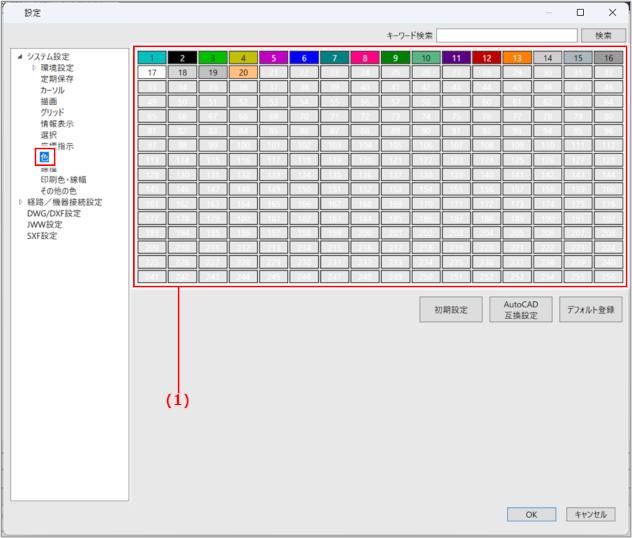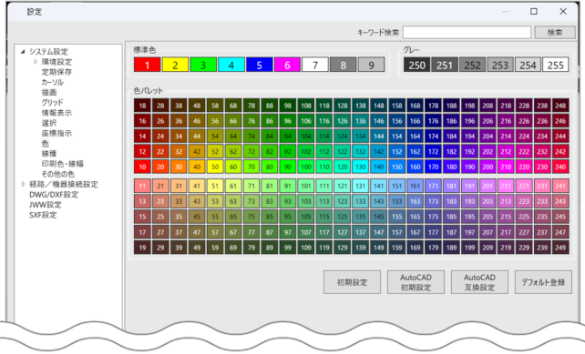 図面作成に使用する色を色番号に割り当てて設定します。色の設定には、FILDER SiXタイプとAutoCADタイプの2種類があります。