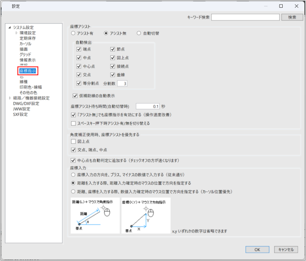 スペースキーを押すたび、座標アシスト機能の有無を切り替える場合はチェックを付けます。 |