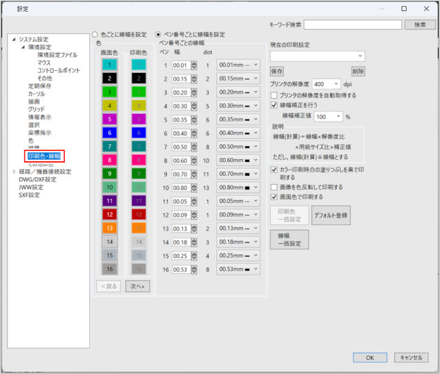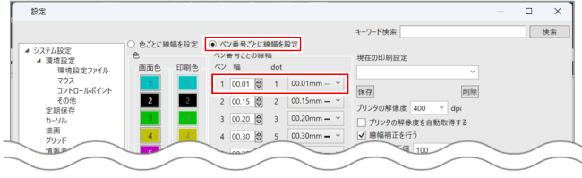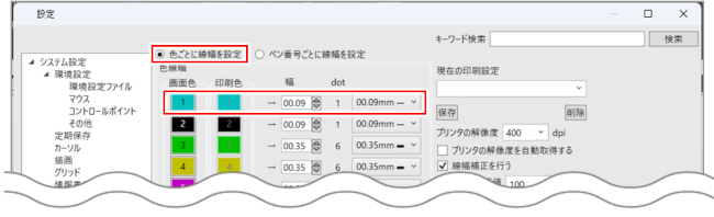 印刷時の線幅を設定します。線幅は色ごとに設定するか、ペン番号ごとに設定(図形ごとに設定)するかを選択します。