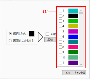 クリックすると、一覧内にあるすべての色番号のうち、チェックがない色番号にはチェックが付き、チェックがある色番号はチェックが外れます。 |
