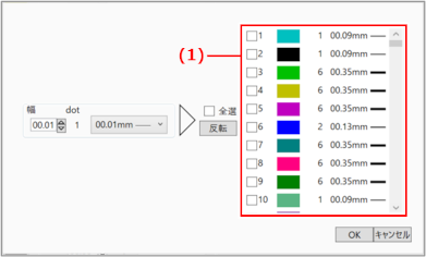 すべてのペン番号が一覧表示されます。チェックを付けたペン番号が、指定した線幅に置き換わります。