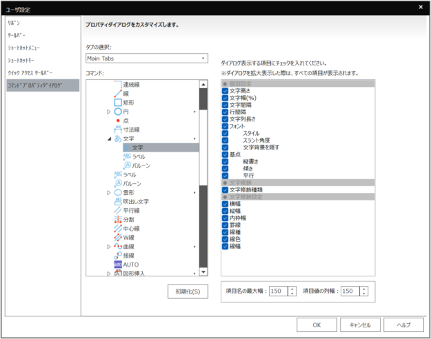 左側のコマンドの一覧から選択したコマンドのプロパティ内容が、右側に表示されます。右側にプロパティ内容が表示されたコマンドのみカスタマイズできます。