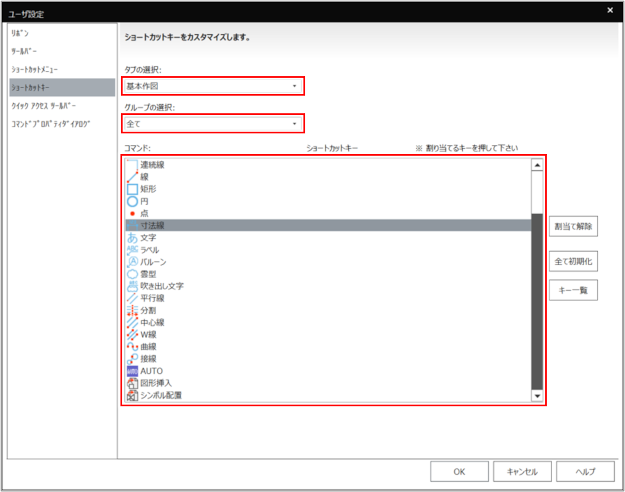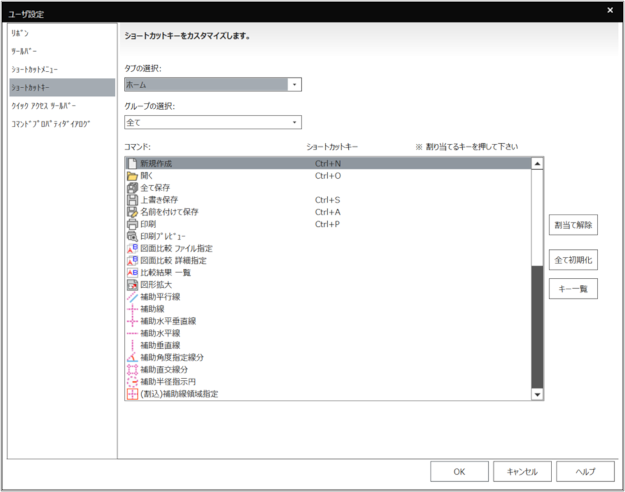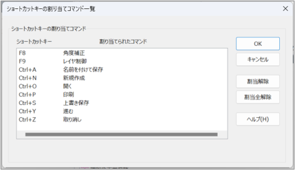 [ショートカットキーの割り当てコマンド一覧]ダイアログが表示され、ショートカットキーの一覧が表示されます。一部または全部のショートカットキーの割り当てを解除することもできます。